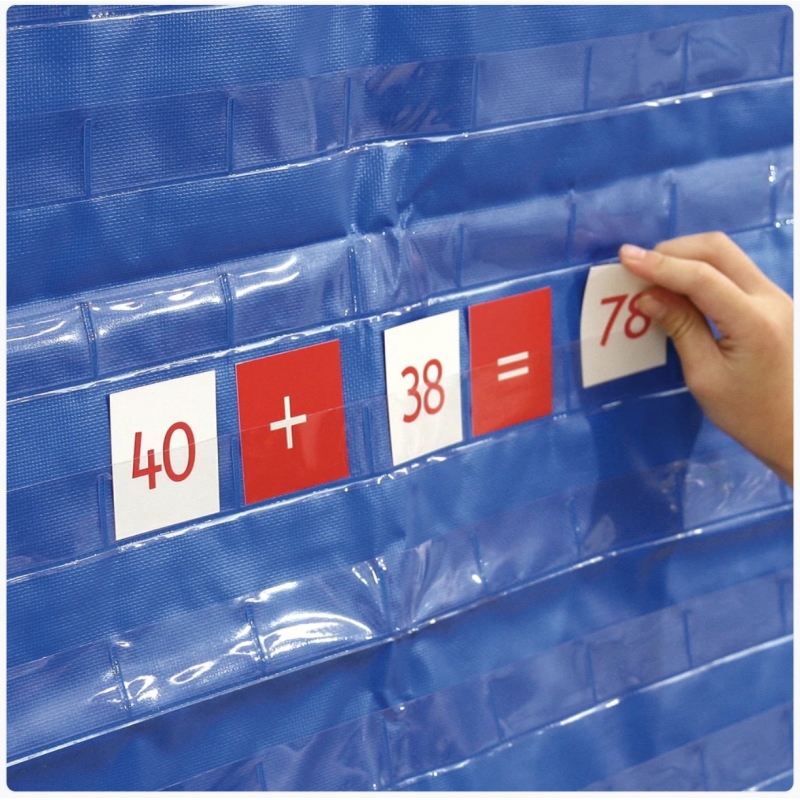 Panel de tela lavable para colgar en una pared o en una pizarra. Los bolsillos donde se colocan las fichas del 1 al 100 son transparentes.